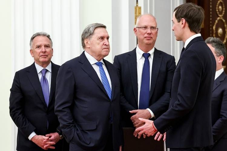 当地时间22日,俄罗斯总统助理尤里·乌沙科夫(前排左一)、俄罗斯直接投资基金首席执行官兼总统外国投资和经济合作特使德米特里耶夫(中间)与到访的美国总统特使威特科夫(后排左一)、美国总统特朗普的女婿库什纳交谈