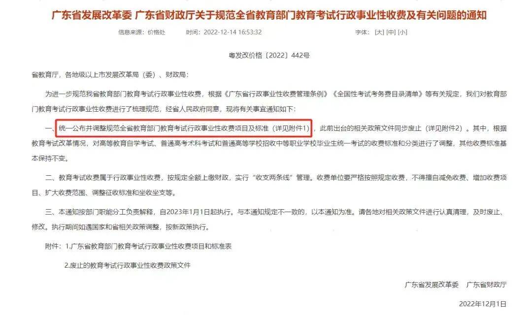 广东省发改委2022年12月发布的收费调整通知,对高等教育自学考试费用作出如下调整:
