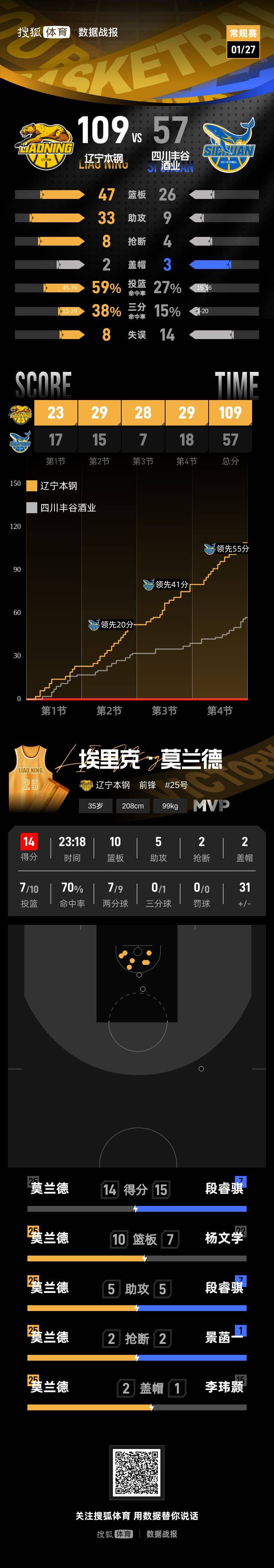【搜狐体育战报】北京时间1月27日CBA常规赛第20轮,客场作战的辽宁本钢以109-57击败四川丰谷酒业,四川丰谷酒业遭遇25连败。埃里克·莫兰德14分10篮板5助攻,段睿骐15分2篮板5助攻。
