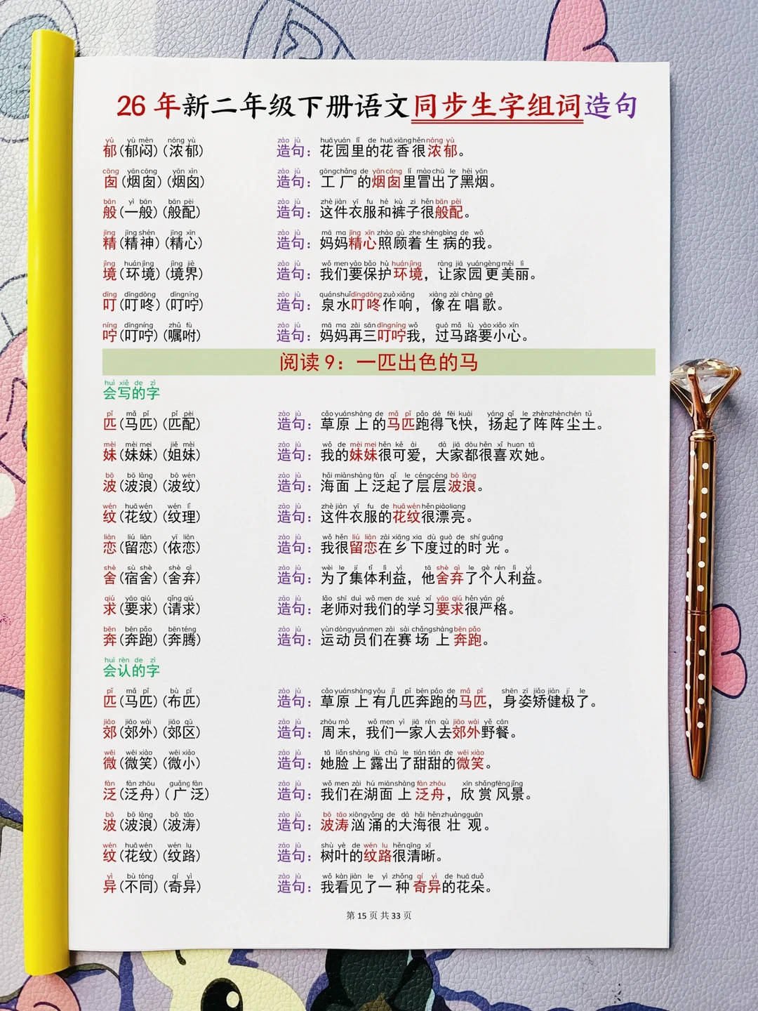 这份 26 年新二年级下册语文《同步生字组词造句》,直接把全册课文的 “会写字、会认字、组词、造句” 打包成 **“识字 + 积累 + 表达” 的全能提分包 **:从《古诗二首》的 “诗、碧、妆”,到《找春天》的 “冲、寻、姑”,再到《中国美食》的 “食、茄、烤”,每一个生字都配了 2-3 个常用组词和贴近生活的造句,连易错字、多音字都单独标注,简直是二年级语文识字与写作的 “救星”!