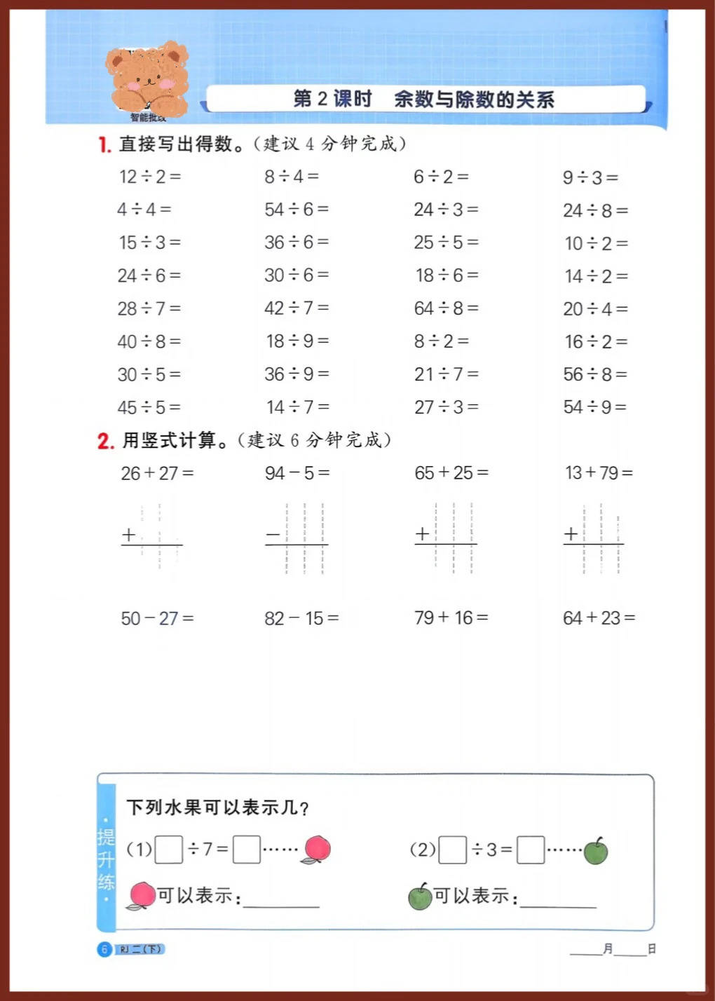 这份人教版二年级下册数学《同步练习》,直接把 “有余数的除法、时间认识” 等核心模块打包成 **“口算 + 竖式 + 拓展” 的全能提分包 **:从表内乘除的口算夯实基础,到有余数除法的竖式计算突破重点,再到 “余数与除数的关系”“括号里最大能填几” 等拓展练习,连计时打卡和分层训练都安排得明明白白,还配了可爱的小熊插图,简直是二年级数学计算攻坚的 “神器”!
