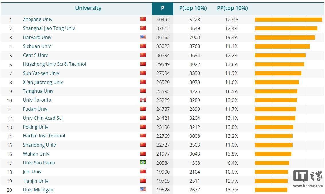 可以看到,浙江大学凭借 40492 篇核心出版物论文遥遥领先于其他大学;不过 P(top 10%)数据中美国哈佛大学依然一骑绝尘,达到 7003 篇,因此还是要正视差距,继续加油。