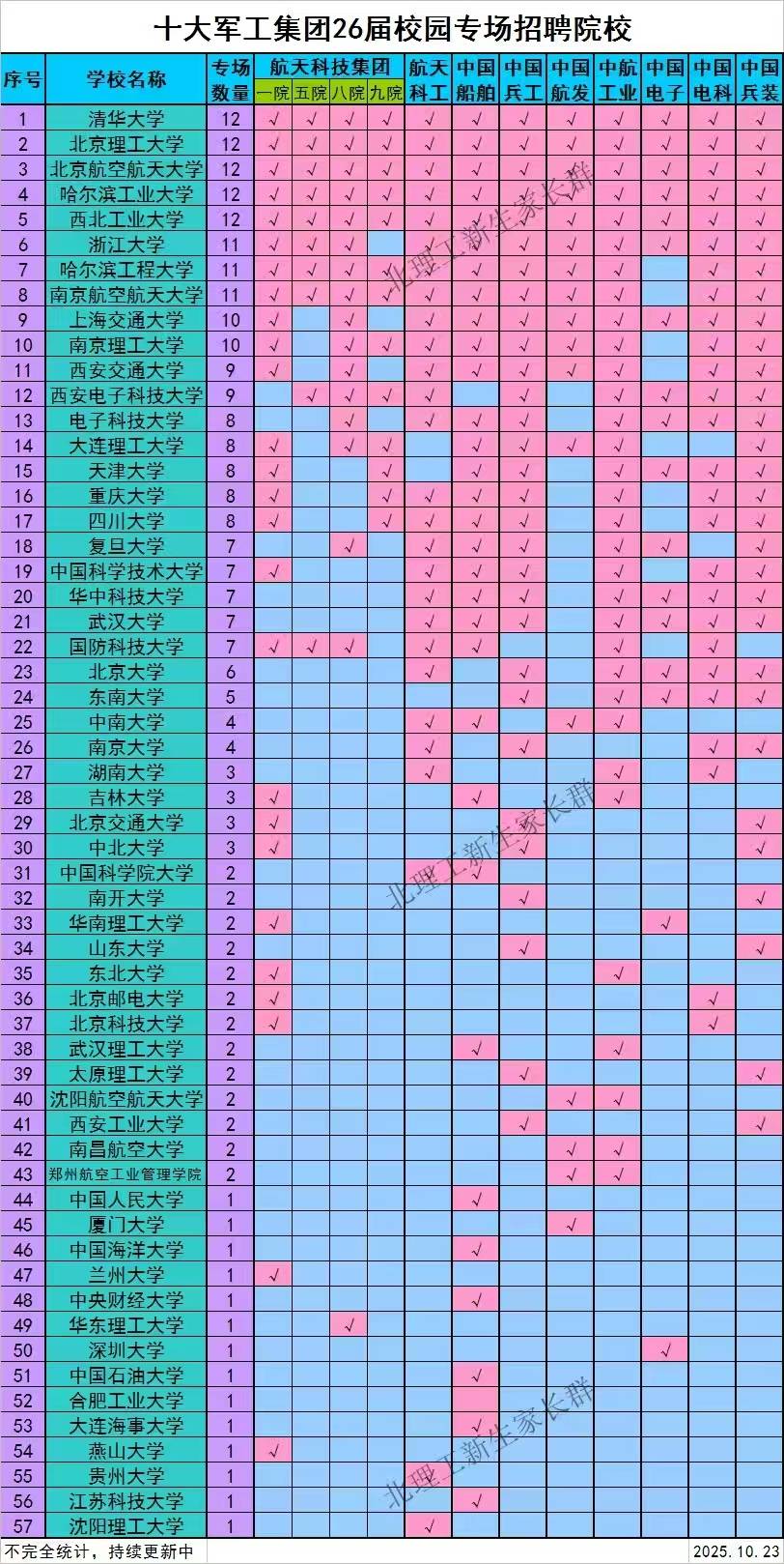我国十大军工集团,航天科技、航天科工、中国电科、中国电子、中国船舶、兵器工业、中航工业、中国航发、中国兵装等,2026年校园招聘专场都爱去哪些高校呢?北京理工大学新生家长群统计了这些数据,下面我们一起来看看吧。