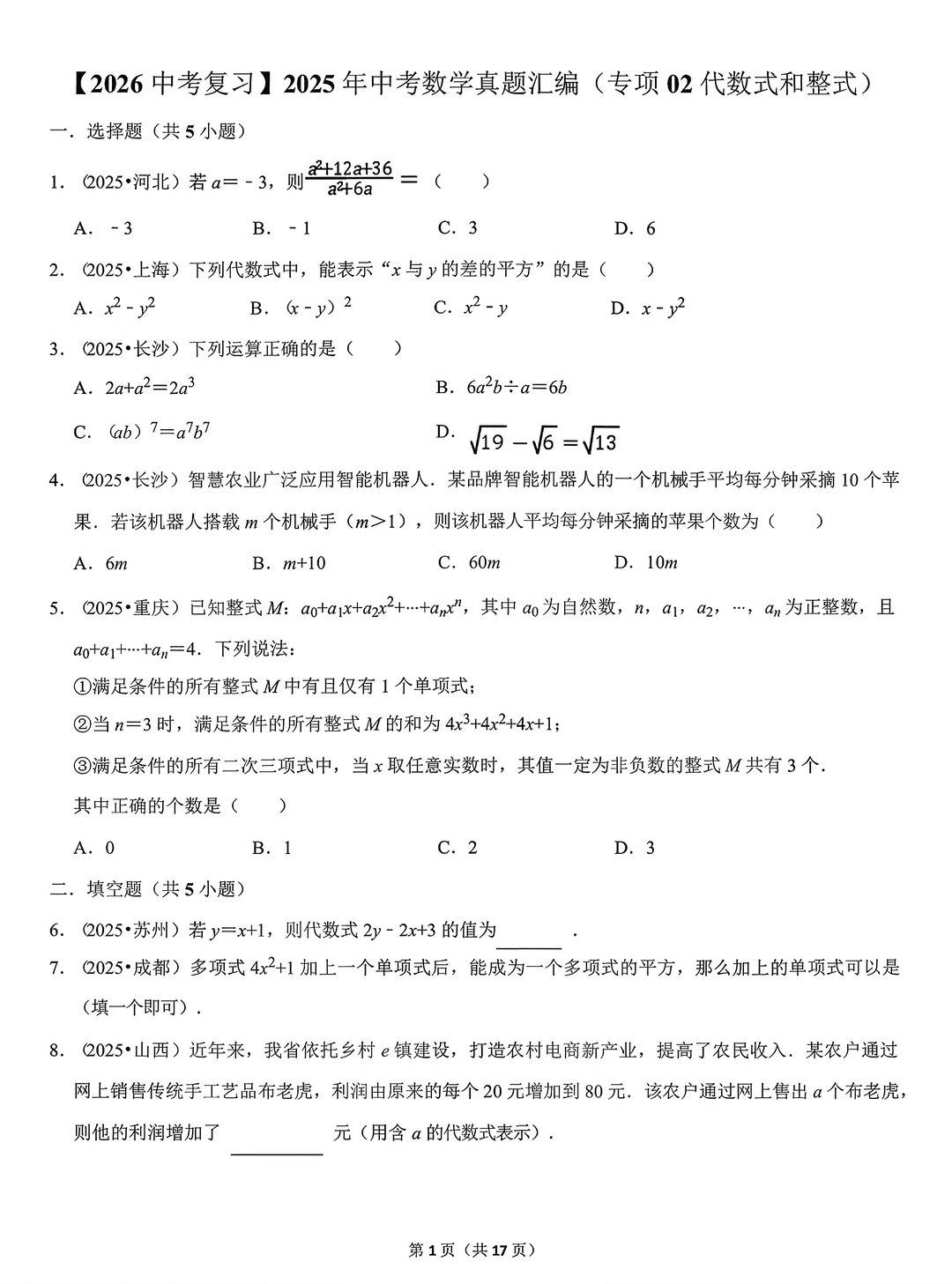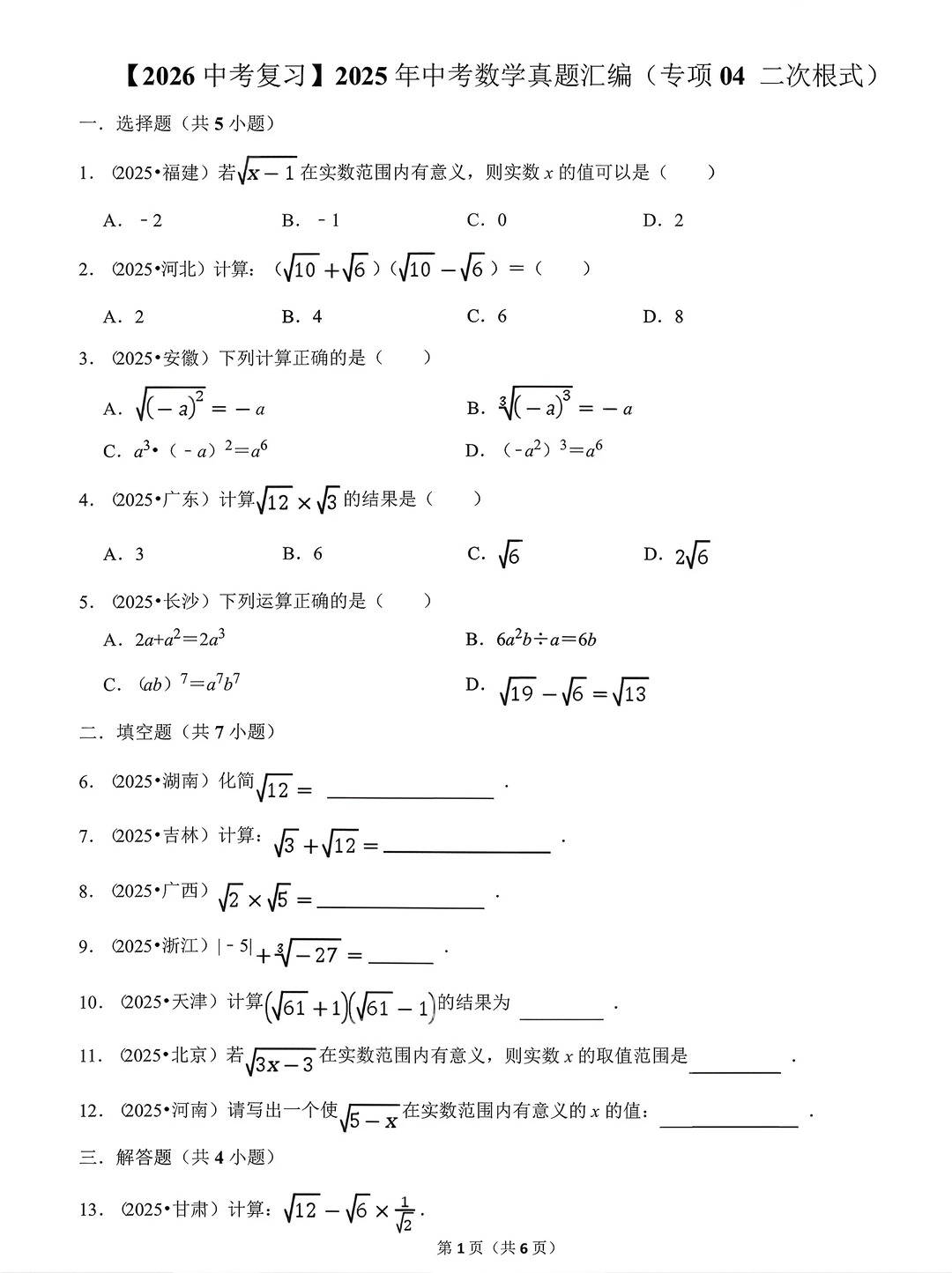 2026 中考数学专用的 2025 年全国中考真题专项汇编,覆盖代数 + 几何两大核心模块,包含:代数专项:实数、代数式和整式、因式分解和分式、二次根式几何专项:平行线、三角形、解直角三角形、四边形全套精选全国各省市最新中考原题,按知识点分类排版,题型含选择、填空、解答,题源新、考点准、专项全,是初三一轮复习、基础巩固、查漏补缺、真题实战的最强刷题资料!