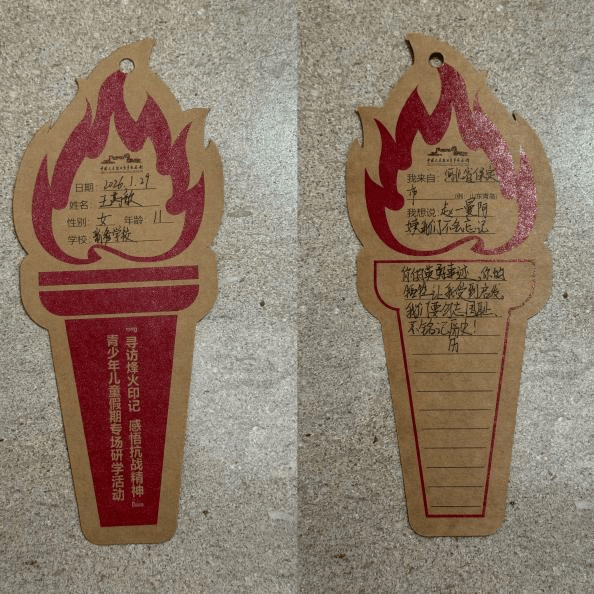 今年抗战馆特别推出了火炬造型留言卡,深受学生喜爱。青少年儿童在完成行走的研学课程后,来到专属留言区,在火炬留言卡上记录感悟、许下承诺,将红色记忆转化为成长动力,伟大的抗战精神也如星星之火,在一代代青少年手中传递下去。
