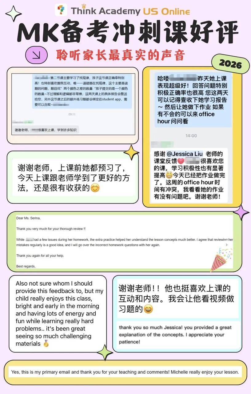 在过去的MK备考冲刺课,Think获得了家长们的一致好评,学生们也取得了优异的成绩。