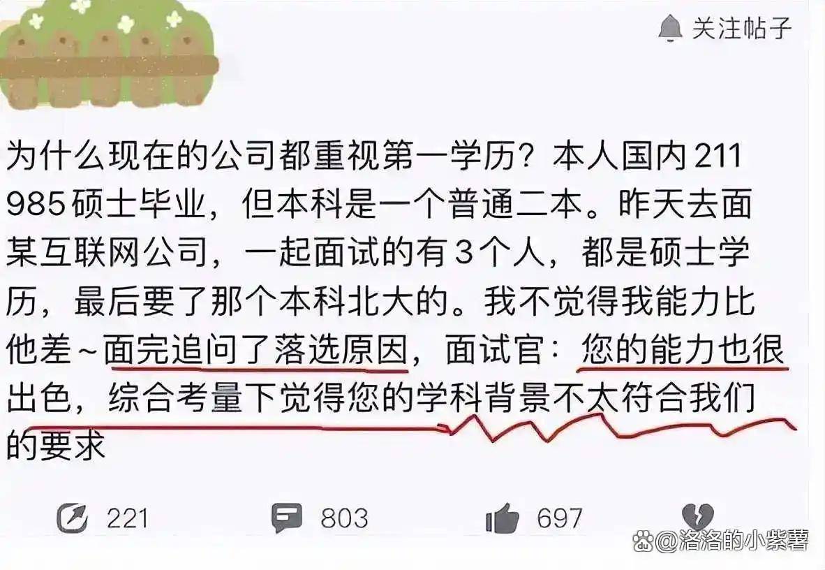 更令人唏嘘的是,最终被录用的那位候选人,不仅硕士毕业于985,本科更是北大毕业,这种“双名校”背景,成了决定性优势,在岗位供大于求的背景下,企业倾向于用最简单粗暴的方式进行人才初筛,“第一学历”成为一道隐形门槛。