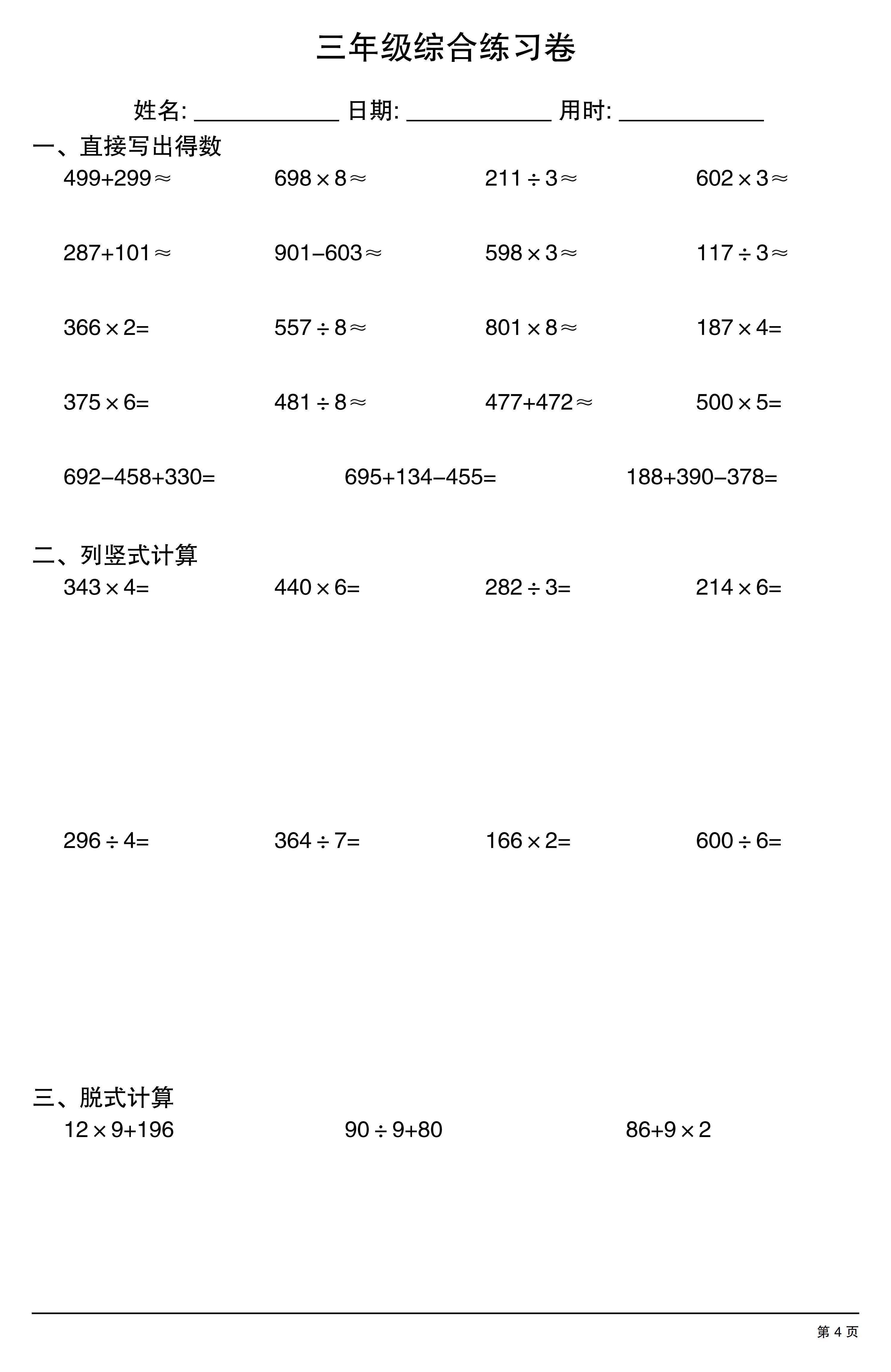今天为大家分享:三年级数学综合练习卷,紧扣三年级下册数学核心知识点,以 “直接写得数”“列竖式计算”“脱式计算” 三大模块为载体,系统覆盖了加减乘除运算、估算、递等式计算等重点内容,是学生巩固计算基础、提升数学综合能力的优质练习资料。