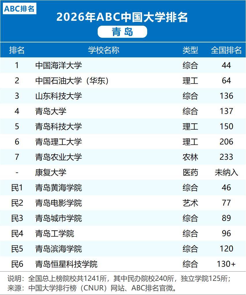 2026年ABC中国大学排名近日揭晓,青岛高校整体表现稳健,呈现多元发展态势。中国海洋大学以全国第44位领跑,彰显综合实力。中国石油大学(华东)位列理工类第64名,能源学科优势突出。山东科技大学和青岛大学分居第136和第137名,学科布局持续优化。青岛科技大学、青岛理工大学等校均跻身榜单,民办高校中青岛黄海学院、青岛电影学院等也取得不错位次,共同映衬青岛高等教育的蓬勃生机。