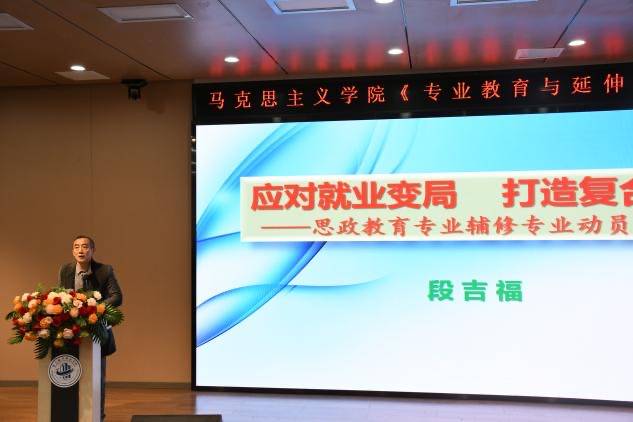 讲座伊始,段院长以“应对就业变局,打造复合优势”为核心,围绕“思政专业发展前景与专业延伸的必要性”展开阐述。结合新时代教育与社会需求,他强调,思政专业师生需更新观念、主动适应社会发展趋势,清醒认清就业形势,充分认识辅修专业的重要性与必要性;既要坚守“为党育人、为国育才”使命,更要直面就业市场对复合型人才的需求转型,突破传统学科边界,推进跨领域融合。一方面深耕马克思主义理论核心素养,筑牢专业根基;另一方面依托辅修专业补充跨学科知识,对接多元岗位场景,通过实践历练构建复合型能力体系,形成差异化就业优势。段院长的致辞站位高远、逻辑严谨,既紧扣就业变局背景,又明晰了专业发展路径,强化了师生的危机意识与发展主动性,坚定了深耕思政领域、以复合能力赋能职业发展的信念。