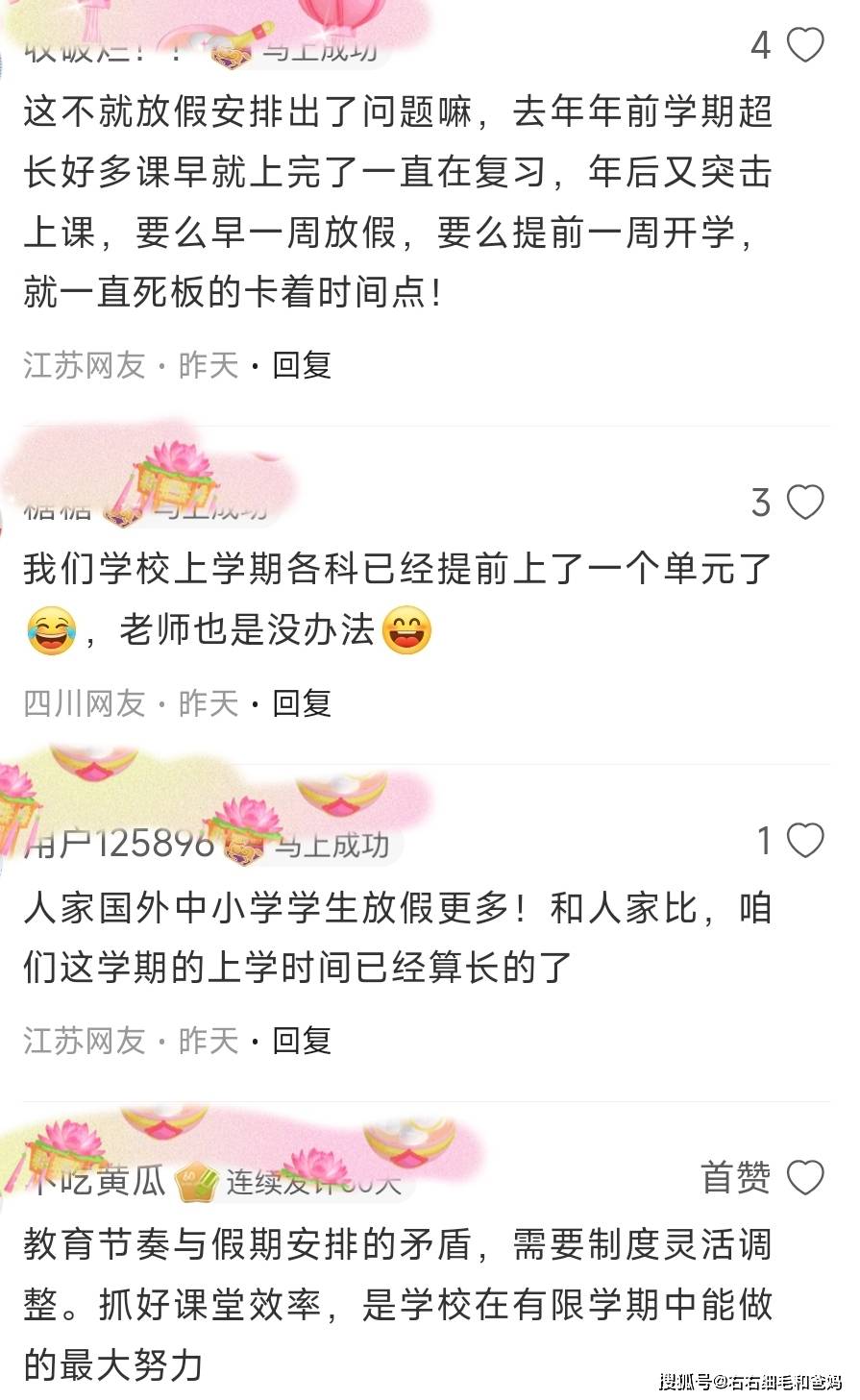 但更多的,是另一种声音。一位山东网友的留言被顶到了前排,说出了不少人的心声:“寒暑假为啥要放这么久?孩子在家没人看,手机电视天天轮流看。开学时间就只管讲,不管孩子接受了多少,节奏放慢,效果是不是更好?”
