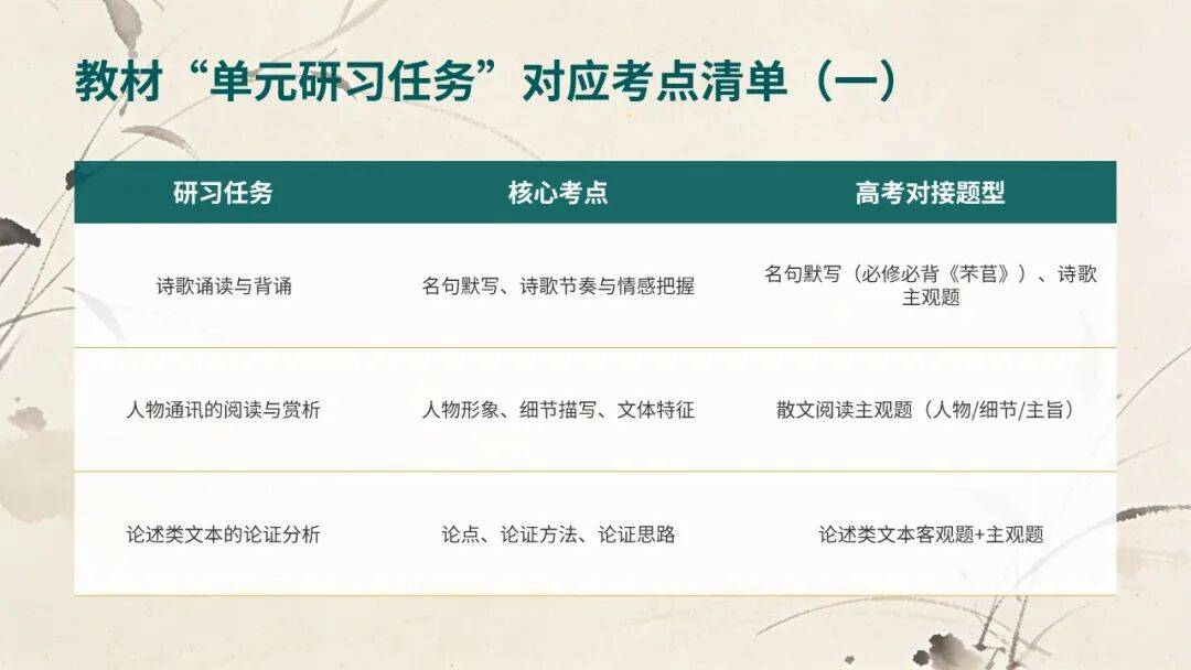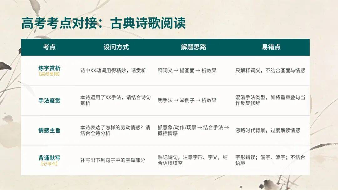 核心考点:意象内涵、情感表达、对比手法(对接《芣苢》《插秧歌》“劳动的艰辛与美好”)