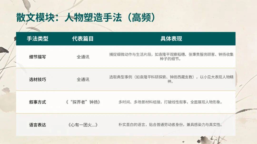 核心考点:人物形象、细节描写、通讯文体特征(对接《喜看稻菽千重浪》《心有一团火,温暖众人心》)
