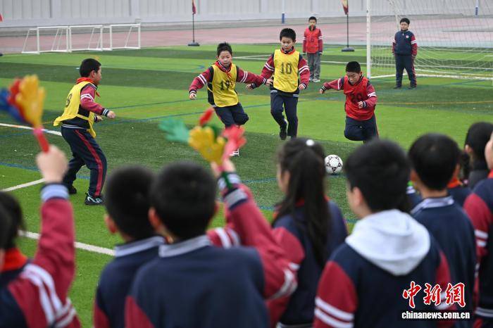 图为小学生进行足球班超联赛。记者 赵文宇 摄