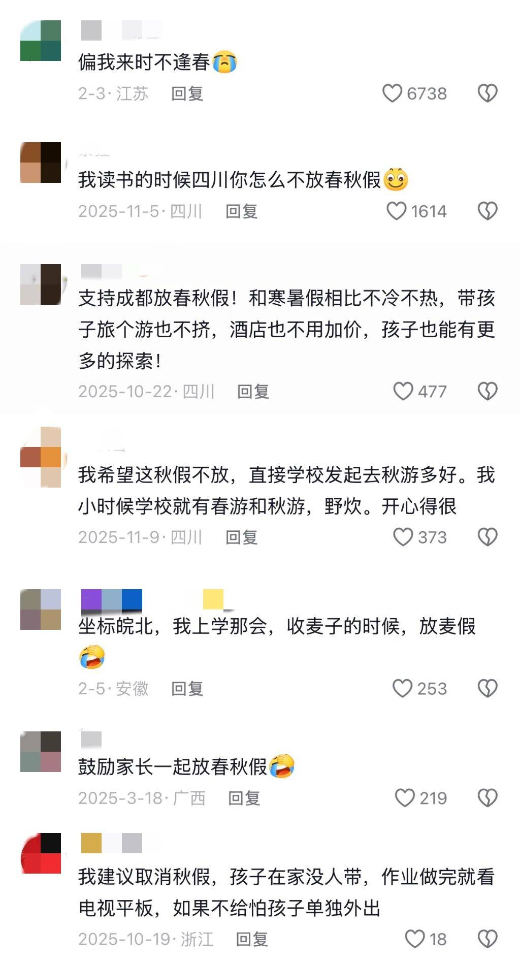 与此同时,密切关注春秋假的人坐不住了。春秋假一出,就有网友调侃“在没有春天和秋天的四川,居然会有春秋假”,还建议江浙家长就近带娃去迪士尼。