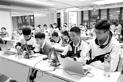 人工智能课上,学生在学习智能体机器人知识。学校供图