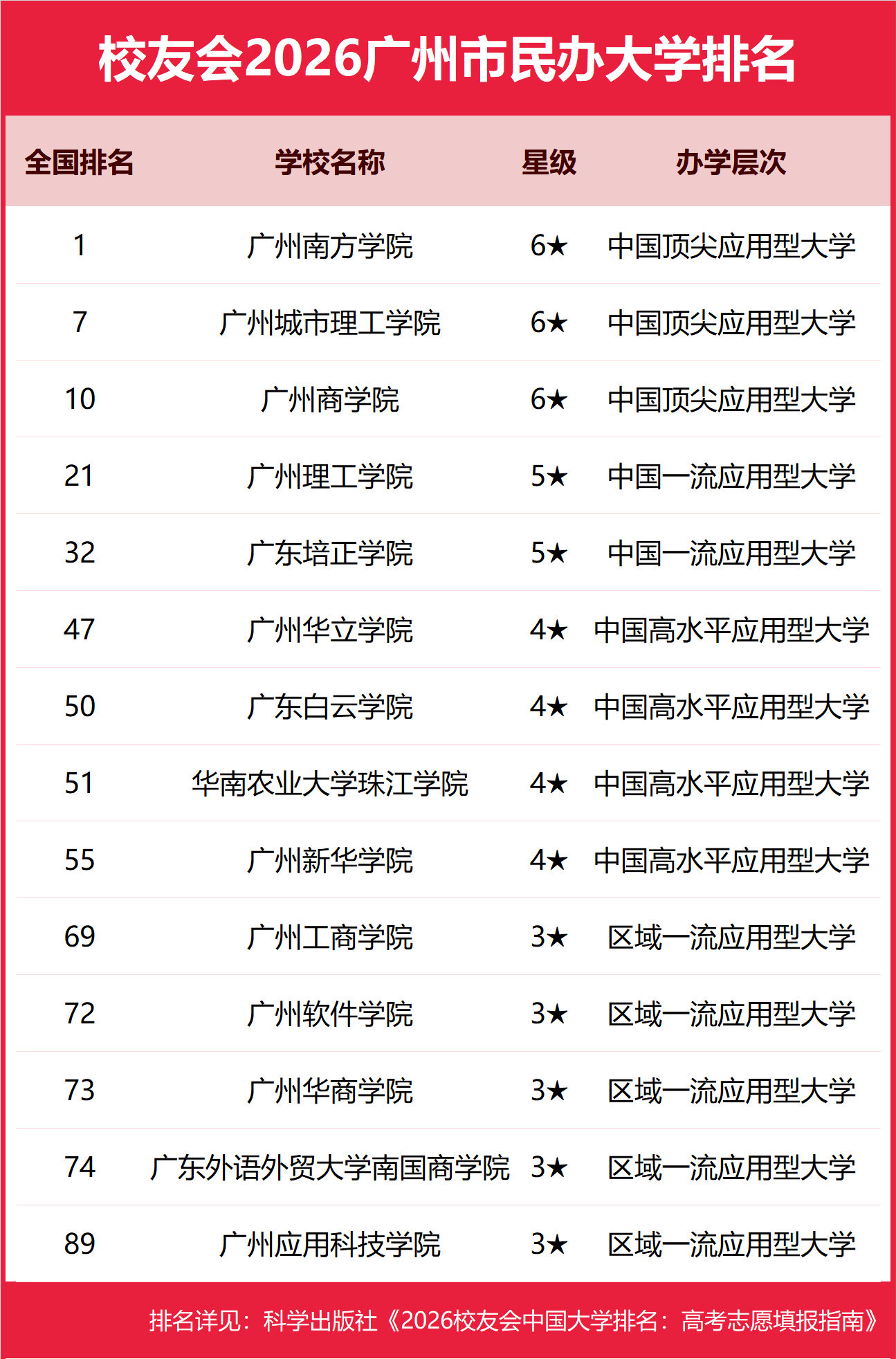 校友会2026广州市民办大学排名,广州南方学院第一,广州城市理工学院、广州商学院前三