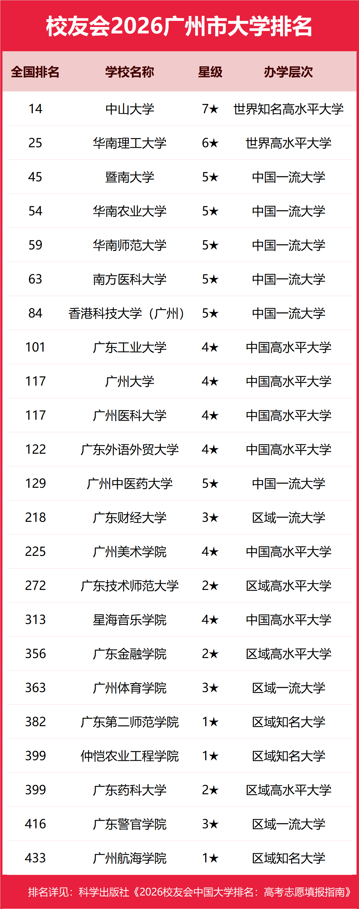 校友会2026广州市大学排名,中山大学第一,华南理工大学、暨南大学前三