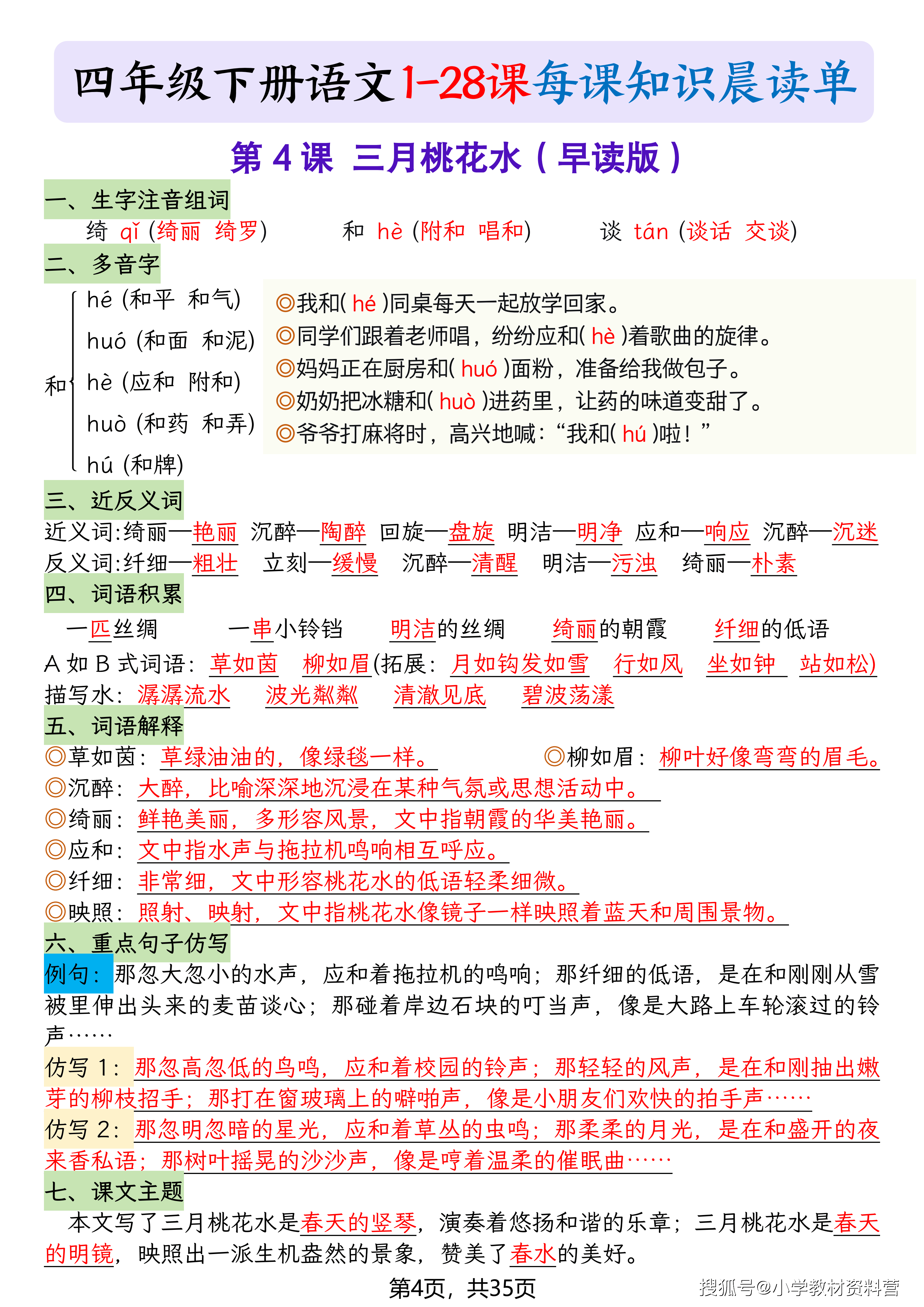 今天给大家分享:清晨的书页轻轻翻开,四年级下册语文的第一单元,就像一阵带着泥土气息的风,吹进了我们的晨读时光。从《古诗词三首》里的田园诗画,到《乡下人家》的烟火日常,再到《天窗》里的想象天地,最后落在《三月桃花水》的春声里,每一篇课文都藏着语文最动人的模样。