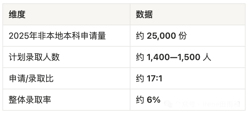 以港大为例,2025/26学年,港大共收到非本地学生申请约2.5万份,而最终录取的非本地学生仅约1400人,整体录取率低至6%。