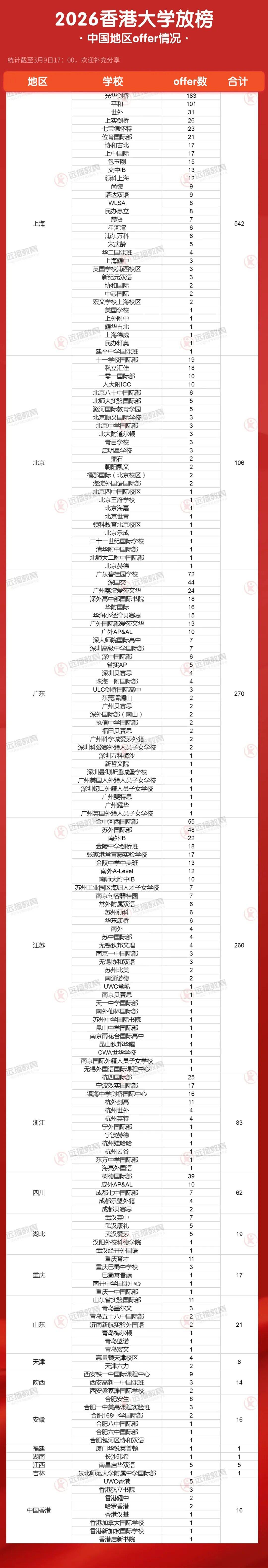 江苏国际学校今年在香港留学方向上成绩突出,以260枚港大offer数超越了北京,位居第三。金中河西拿下55枚、苏外国际部斩获48枚,表现相当亮眼,还有苏州海归人才子女学校、南京句容碧桂园、苏州领科、华东康桥、狄邦文理、狄邦华曜等校也均有多枚offer入账。