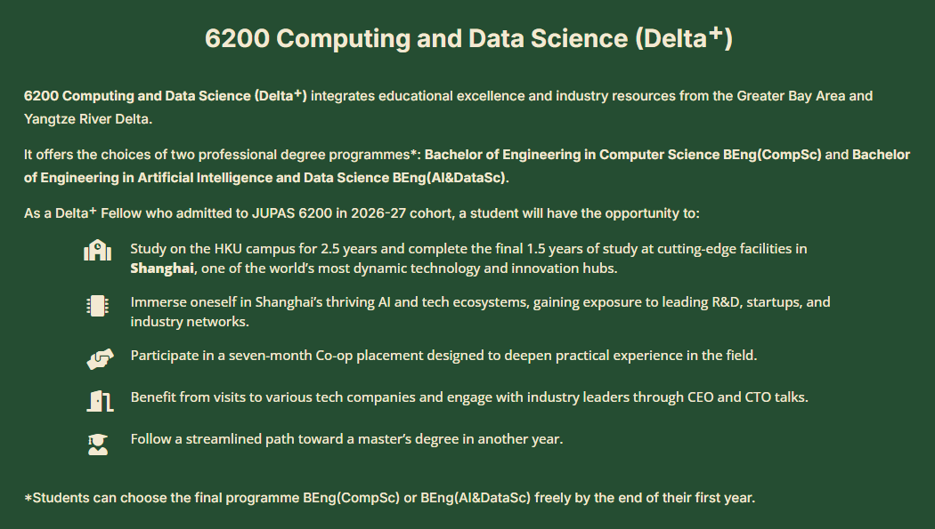 本硕衔接:本科期间可预修两门硕士课程,第五年有机会衔接港大计算机科学硕士,5年拿本科+硕士学位。