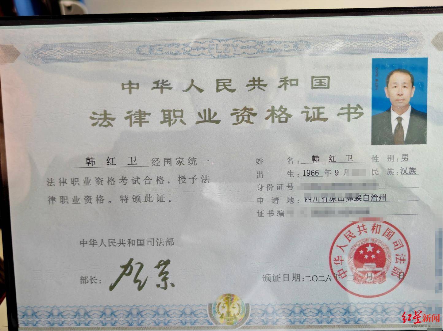 ▲韩红卫的法律职业资格证书