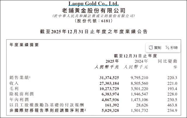 3月23日,黄金一片大跌声中,老铺黄金发布了2025年度业绩报告。