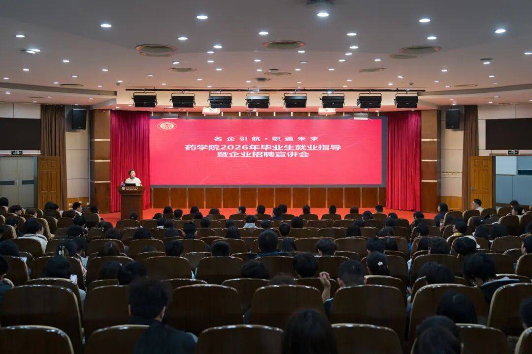 为深入贯彻落实国家关于促进高校毕业生就业工作的决策部署,深化产教融合与校企合作,3月27日,药学院在旭光厅举行2026年毕业生就业指导暨企业招聘宣讲会。特邀恒瑞医药、正大天晴、科伦药业、先声药业、华润三九医药、扬子江医药、晖致医药、汇医达、星兰生物9家国内知名医药企业进校,通过“医药名企招聘政策全解读”“企业‘面对面’招聘与咨询”等环节,为2026届全体毕业生及2027届实习生提供就业指导。