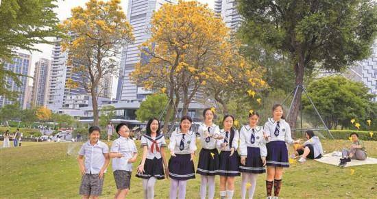 春假均与4月4日至6日的清明法定假日相连,形成连续假期。多数学校为4—5天假期。此举源于2026年政府工作报告中“支持有条件的地方推广中小学春秋假”的倡导。深圳市教育局表示,全市不作统一安排,鼓励有条件的区和学校先行探索。各校在春假期间均提供弹性托管服务,以解决双职工家庭的实际需求。图为一群小学生4月2日在深圳人才公园拍照嬉戏玩耍。