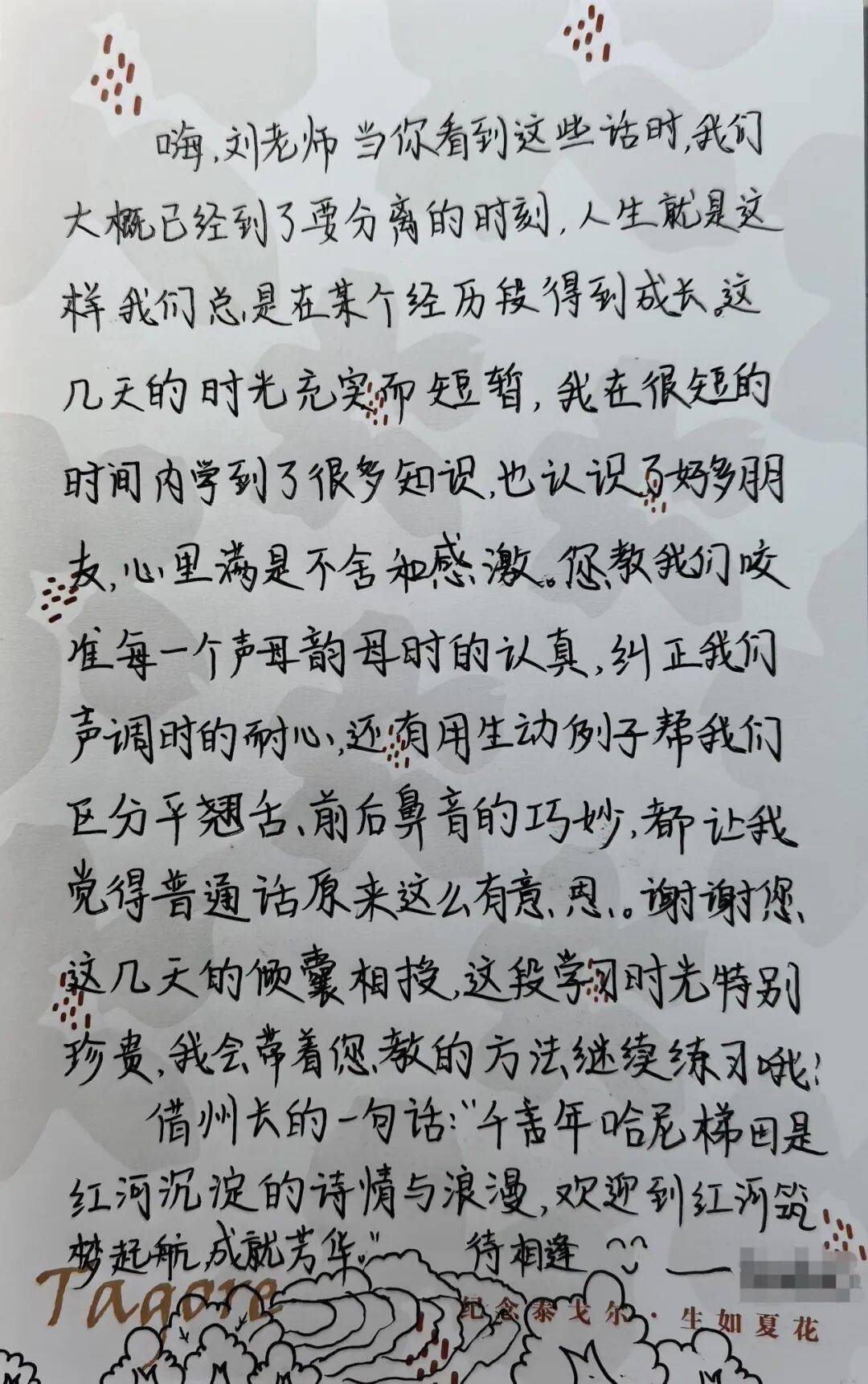 刘佳蕾收到云南红河学员手写信