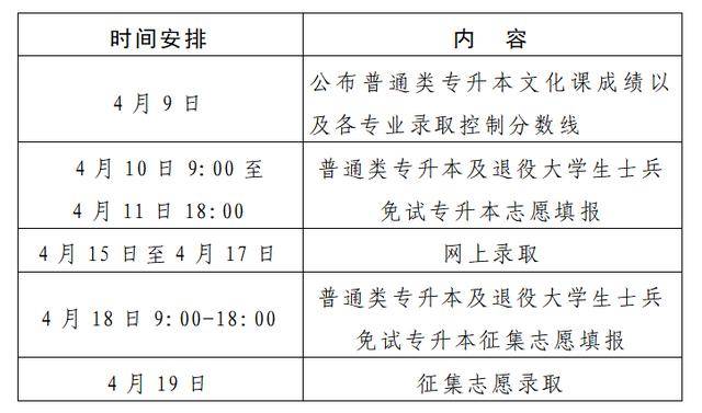 4月15日至4月19日进行普通类专升本和退役大学生士兵免试专升本录取。普通类专升本总成绩相同的考生,依次按英语、专业综合科目成绩排序。