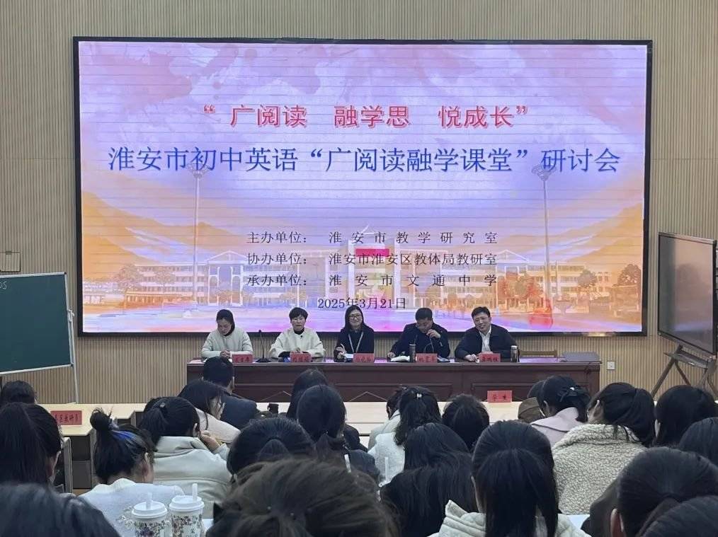 人间最美三月天,春花烂漫绽新颜。为落实义务教育课程标准要求,进一步推动我市“广教研”活动走深走实,强化“融学课堂”建设,促进课堂教学改革,探究学习方式变革,3月21日,由淮安市教研室主办、淮安区教研室协办、淮安市文通中学承办的初中英语“广阅读融学课堂”主题研讨活动在我校举行。南通市教科院陈亚红副院长、淮安市初中英语教研员杨晓梅、淮安区教研室主任姚贯军、淮安区英语教研员刘继娟、淮安市文通中学校长龚鹏程及来自全市兄弟学校200余名老师参与了此次活动。