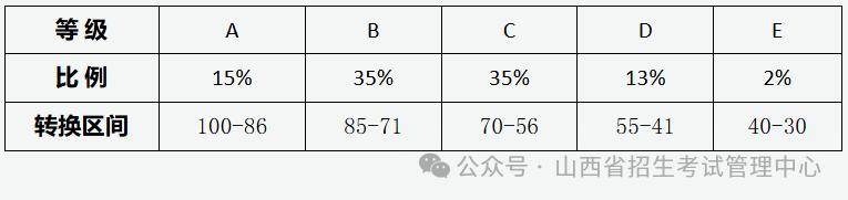 第二步,将A至E五个等级内的考生原始分,按照等比例转换规则,转换到100~86,85~71,70~56,55~41和40~30五个分数区间,根据转换公式计算,四舍五入取整数得到考生的等级转换分。转换后的成绩一分一档,考生排序不变。