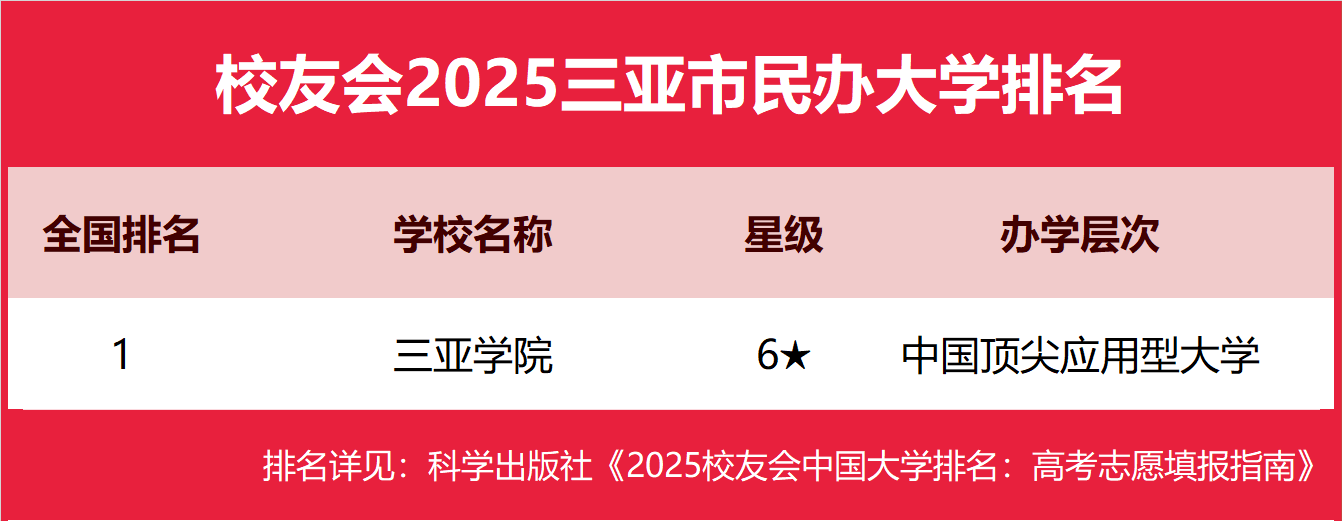 在校友会2025中国民办大学排名中, 三亚学院综合办学实力最强、最具竞争力、办学水平最高,位居全国第1名,稳居2025三亚市民办大学排名首位。