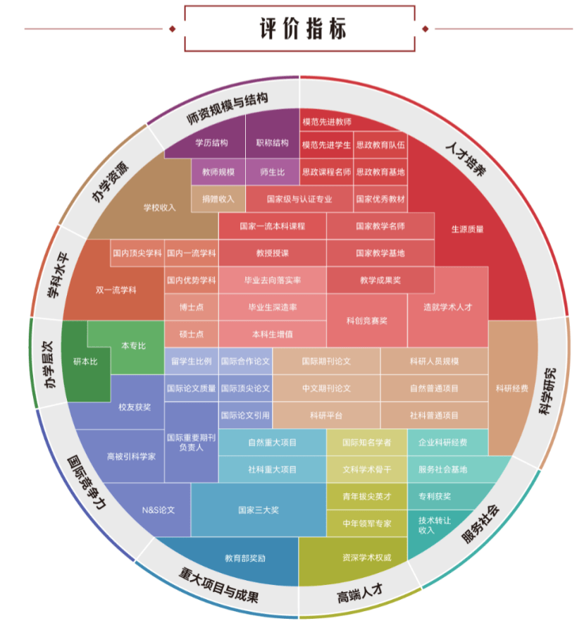 设置办学层次、学科水平、办学资源、师资规模与结构、人才培养、科学研究、服务社会、高端人才、重大项目与成果、国际竞争力共十个评价模块,细分37个评价维度,内嵌104项评价指标,涉及392个评价变量,是对中国大学办学水平的立体化监测式评价。
