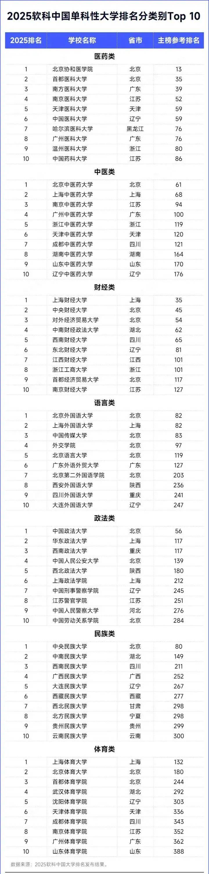 再来看下单科性大学排名(医药类、中医类、财经类、语言类、政法类、民族类、体育类)。