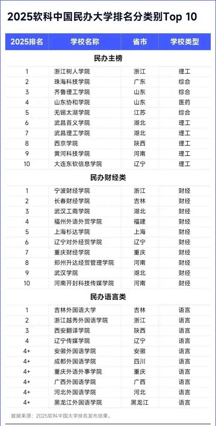 民办高校分为民办高校主榜、民办财经类高校排名、民办语言类高校排名3个榜单。