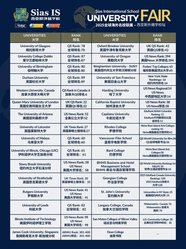 联展活动中,既有蜚声全球的学术殿堂,也有专注特色领域的精英学府。此外,以亚当斯密商学院闻名世界的美国格拉斯哥大学、拥有欧洲顶尖商学院的爱尔兰都柏林大学、罗素集团成员之一的伯明翰大学、以人文学科见长的英国杜伦大学、法学院全球前50的英国伦敦玛丽女王大学、天文与光学科学全球领先的美国亚利桑那大学等名校的招生官也将来到现场,助力学子拓展认知边界,无缝衔接国际舞台。