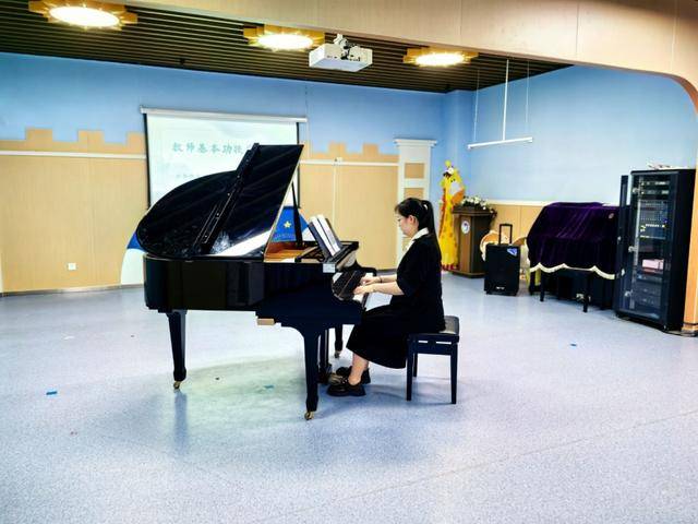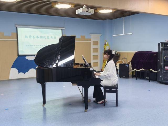 边弹边唱是有效开展音乐活动的基本保证,此次分为“抽选曲目”和“自备曲目”两部分。抽选曲目选自幼儿园日常音乐教学曲库,涵盖儿歌、童谣等不同风格,考验教师对教材的熟悉度与即兴表现力;自备曲目则由教师自主选择,充分展现个人音乐理解与艺术创造力。考核现场,教师们从容登台,端坐于钢琴前,周身萦绕着优雅与恬静的气息。一曲曲悠扬的琴声,动听的儿歌,随着教师跳动的手指自钢琴里溢出,节奏精准、和弦流畅、童趣十足的歌声与琴声交织,展现出了教师们扎实的弹唱基本功。悦耳的曲调在空气中悠悠回荡,久久不绝,宛如一场听觉的盛宴,令人沉醉。