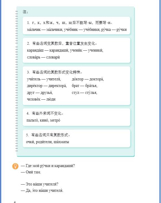 - 语法:学习名词的属格形式及用法,用于表示所属关系,如 “книга учителя(老师的书)”,其中 “учителя” 是 “учитель” 的属格形式。