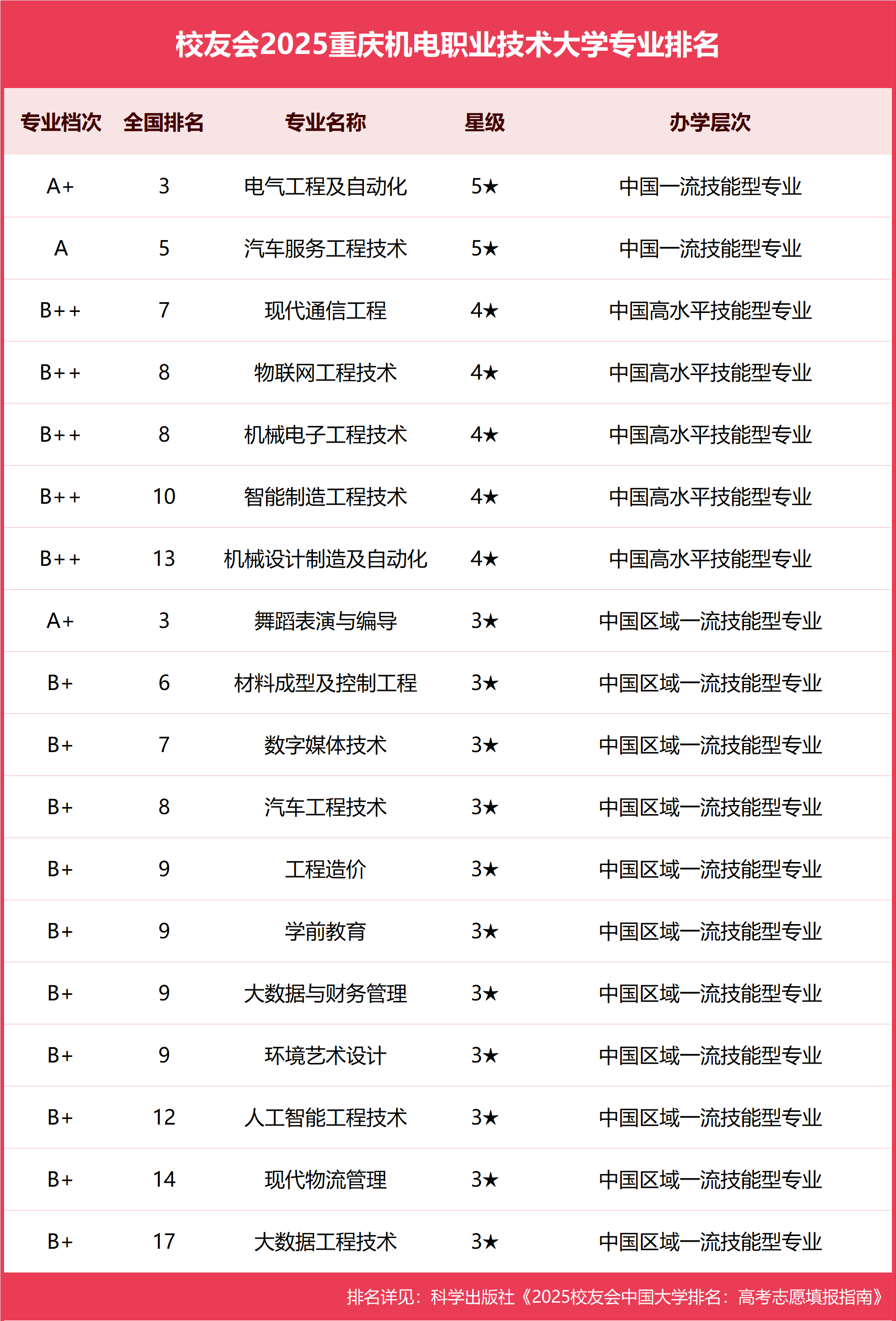 榜单显示,在最新校友会2025重庆机电职业技术大学专业排名中, 电气工程及自动化、汽车服务工程技术等专业获得2025中国五星级技能型专业(5★),进入2025中国一流技能型专业行列。
