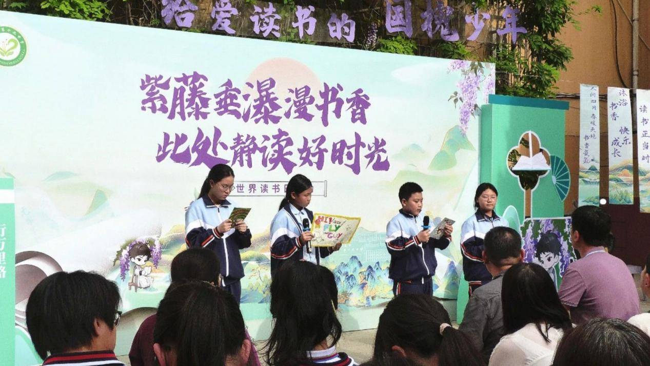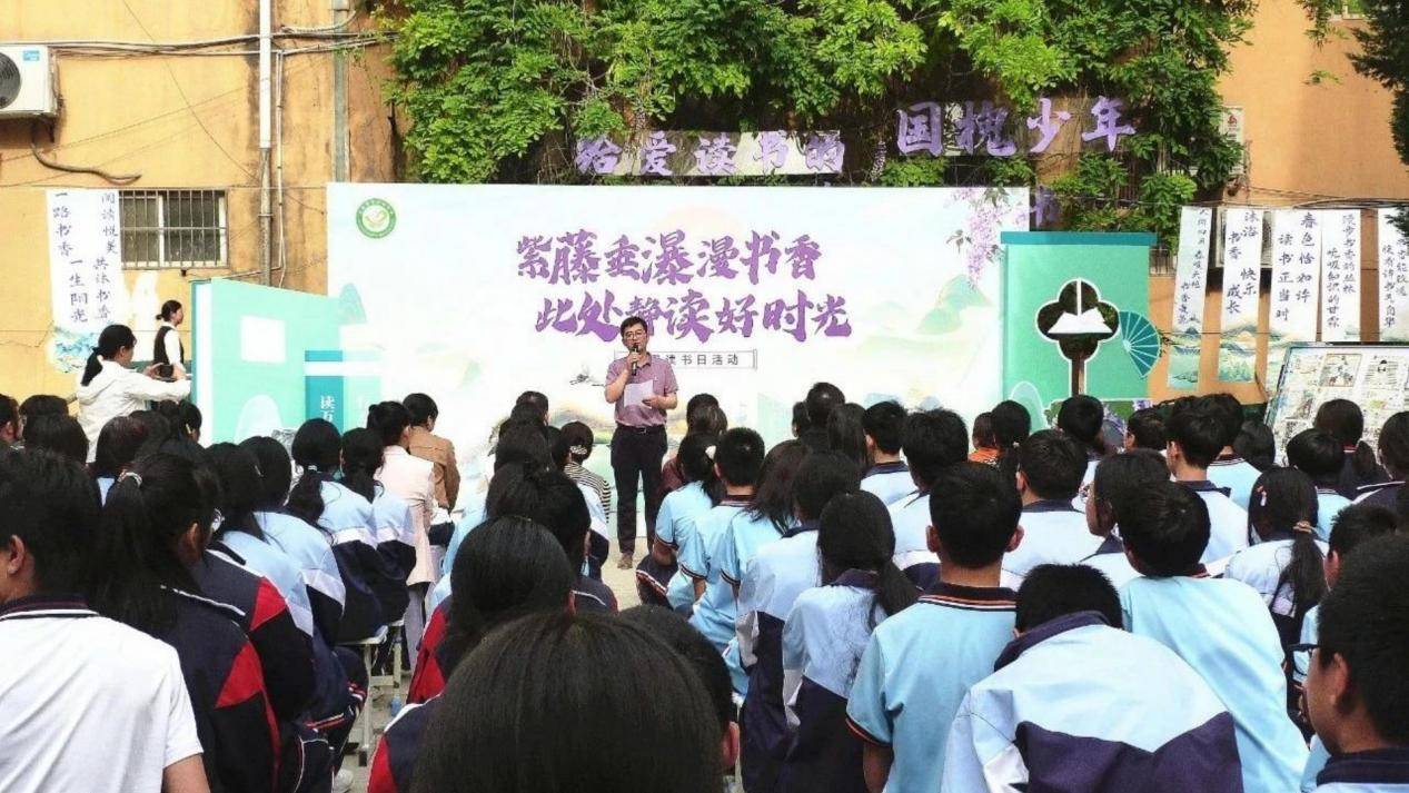 4月24日下午,西安市第十九中学开展了一场以“紫藤垂瀑漫书香,此处静读好时光”为主题的阅读盛会。作家鹿丁联、家长代表与该校文学社、英语社成员及百余名师生共聚槐园,以书为媒,共赴一场跨越时空的文化对话。
