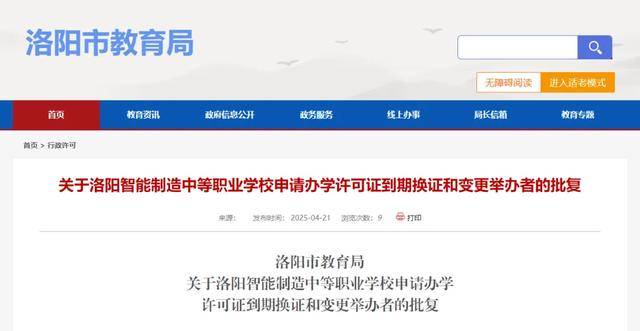 1.同意为洛阳智能制造中等职业学校换发办学许可证,办学许可证有效期限为2025年4月17日至2028年4月16日。
