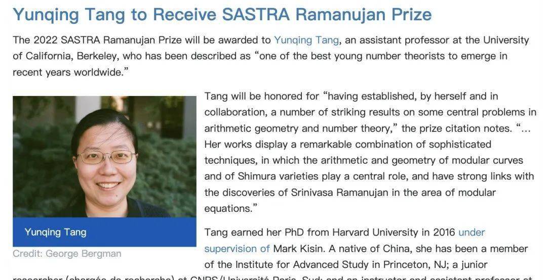 唐云清现在美国加州大学伯克利分校任教,2022年获得拉马努金奖(SASTRA Ramanujan Prize),是第一个获此奖的华人女性。