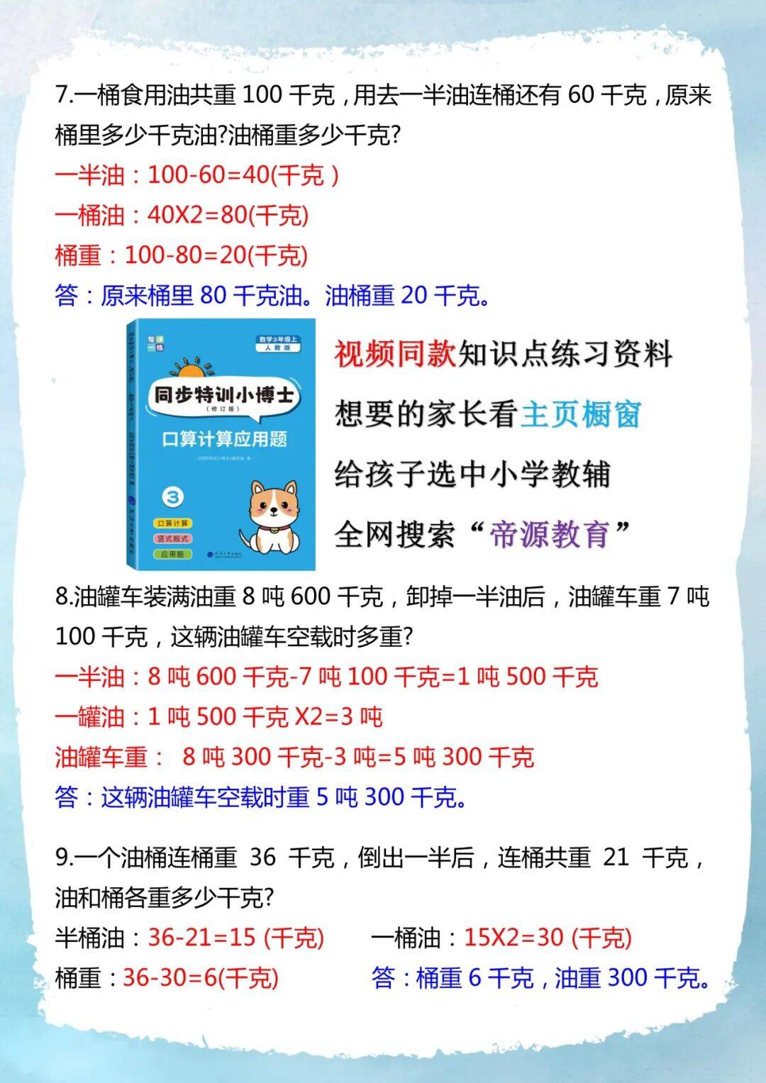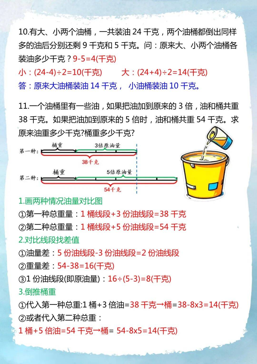 11.一个油桶里有一些油,如果把油加到原来的3倍,油和桶共重38千克。如果把油加到原来的5倍时,油和桶共重54千克。求原来油重多少千克?桶重多少千克?