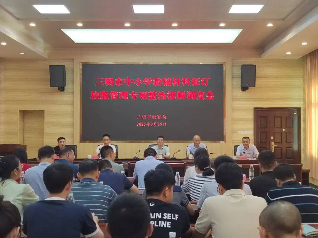 2025年9月19日上午,三明市教育局在六楼会议室召开全市中小学教辅材料征订校服管理专项整治视频调度会。市教育局党组成员伊永河、市教育局四级调研员余百火出席并讲话。各县(市、区)教育局分管教辅征订、校服选购的有关局领导以及负责教辅、校服管理工作的股(科)室负责人,市直属中小学分管校长和相关处室负责人参加了会议。