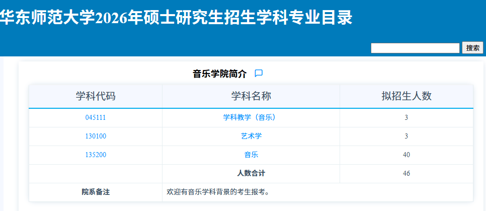 招生学科专业目录是招生简章的重要组成部分,考生须在报考前查阅《华东师范大学2026年硕士研究生招生学科专业目录》,明确招生院系、招生学科专业及研究方向、学习方式、招生计划、初试科目、学费、学制(即基本修业年限或基本学习年限,以下同)、备注等信息。其中,招生计划供参考,最终招生录取人数可能根据生源情况、教育部下达的计划数,并综合学校发展等情况有所调整。