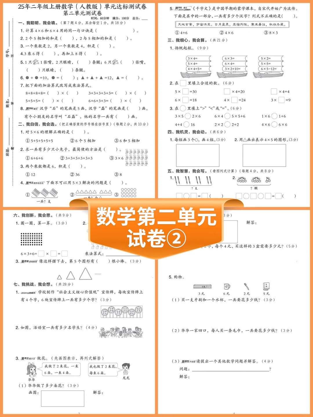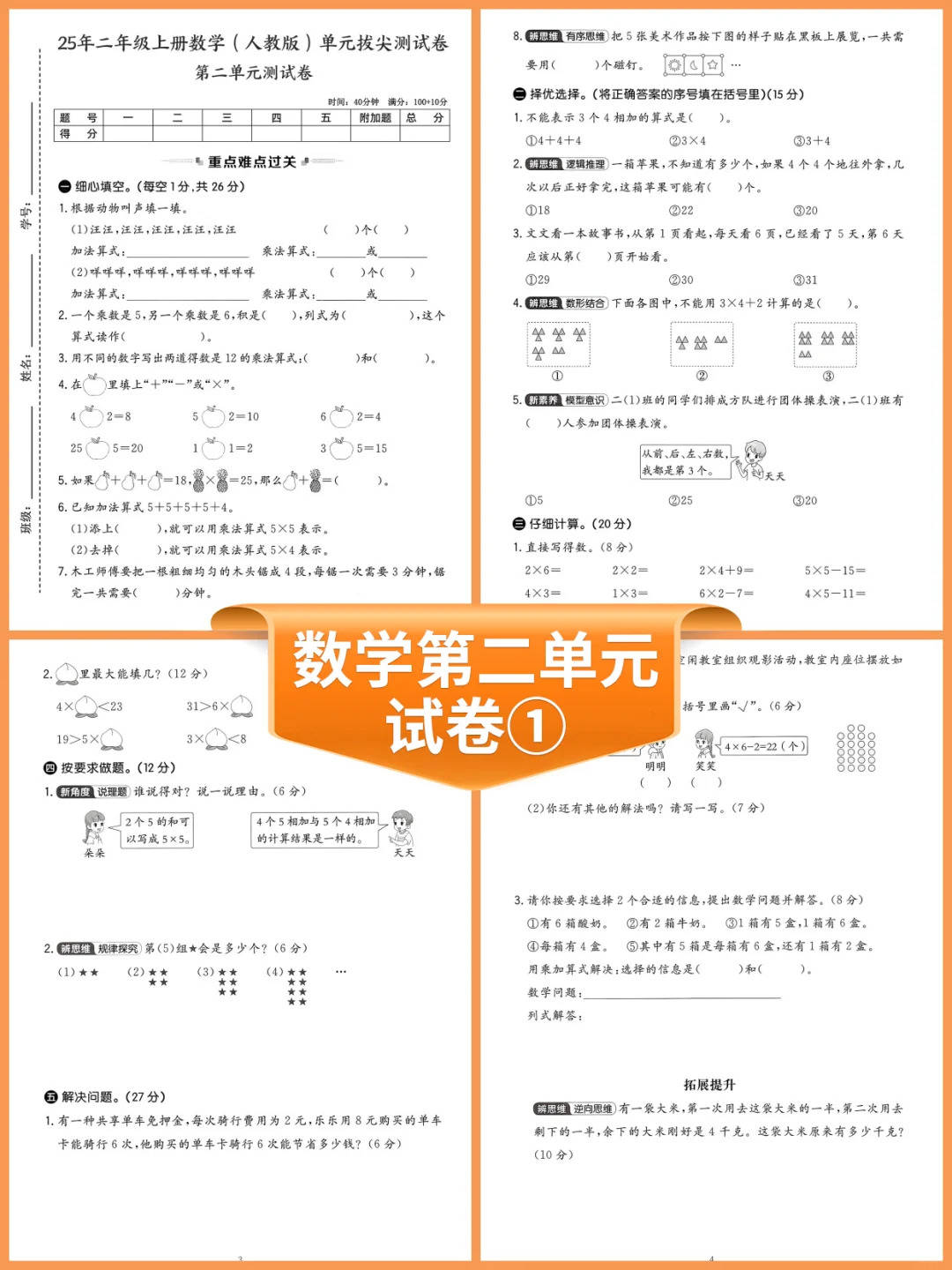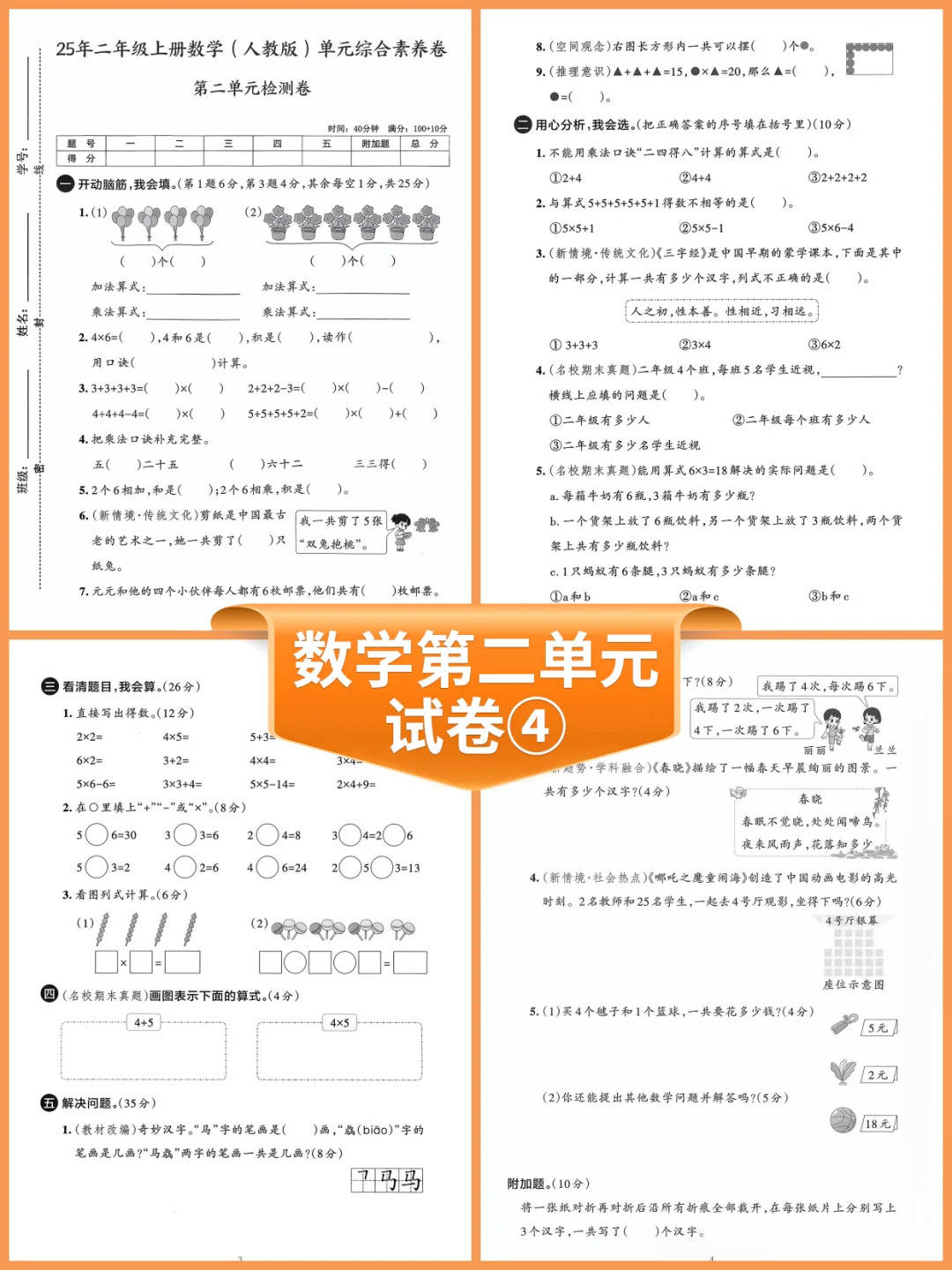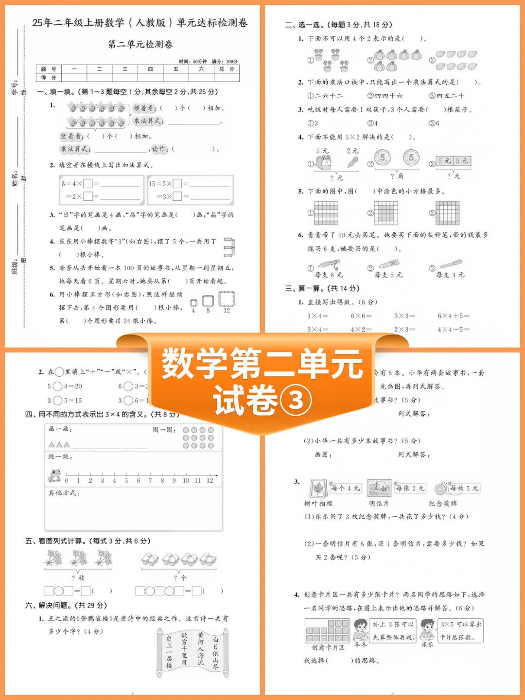 今天挖到的 25 学年二年级上册语数单元测试卷超棒!语文有第二单元的综合素养卷、综合评测卷、达标检测卷、拔尖测试卷,涵盖看拼音写词语、字词辨析、课文内容填空、阅读理解、看图写话等;数学是第二单元拔尖测试卷,有乘法相关的填空、选择、计算、解决问题等题型,还融入新思维题目。二年级是语数知识打基础的关键期,语文的字词练习能巩固识字写字;课文内容填空加深对课文的记忆;阅读理解锻炼阅读能力与思维;看图写话培养表达能力。数学的乘法题目,助力学生理解乘法意义、掌握运算,新思维题还能开拓数学思维。不管是日常知识巩固,还是单元知识检测,这些试卷都能全方位助力二年级学生提升语数能力,让学习更扎实、有趣,真的是二年级语数学习的好帮手~
