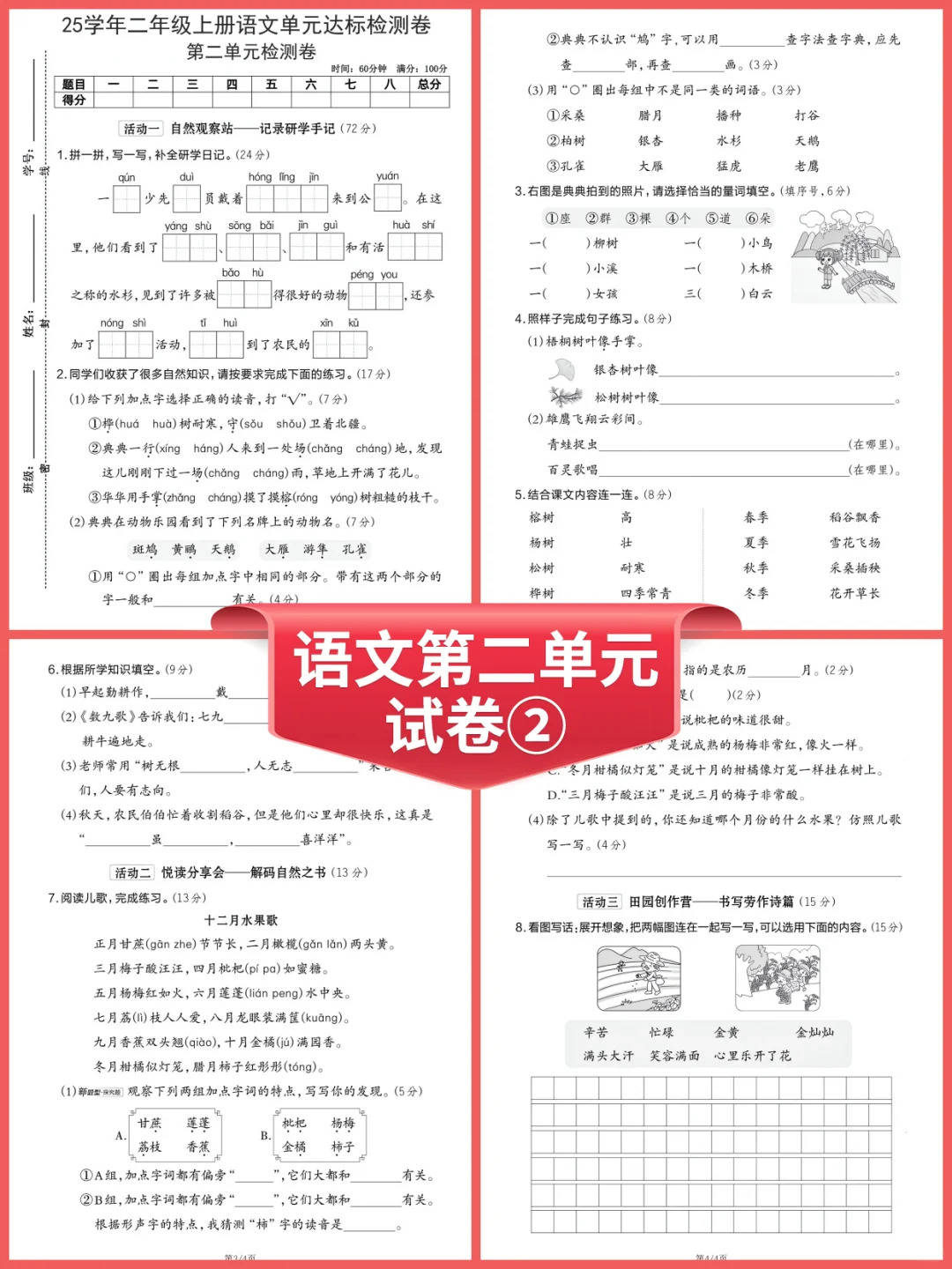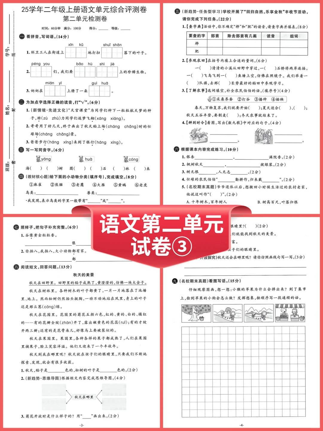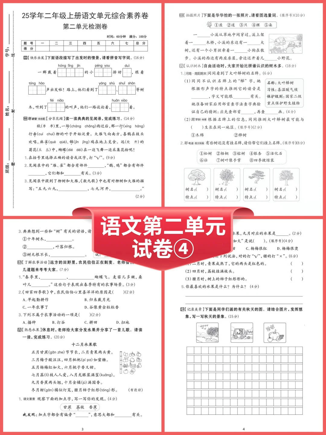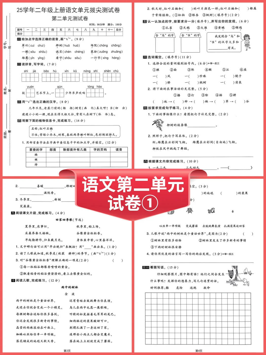 今天挖到的 25 学年二年级上册语数单元测试卷超棒!语文有第二单元的综合素养卷、综合评测卷、达标检测卷、拔尖测试卷,涵盖看拼音写词语、字词辨析、课文内容填空、阅读理解、看图写话等;数学是第二单元拔尖测试卷,有乘法相关的填空、选择、计算、解决问题等题型,还融入新思维题目。二年级是语数知识打基础的关键期,语文的字词练习能巩固识字写字;课文内容填空加深对课文的记忆;阅读理解锻炼阅读能力与思维;看图写话培养表达能力。数学的乘法题目,助力学生理解乘法意义、掌握运算,新思维题还能开拓数学思维。不管是日常知识巩固,还是单元知识检测,这些试卷都能全方位助力二年级学生提升语数能力,让学习更扎实、有趣,真的是二年级语数学习的好帮手~